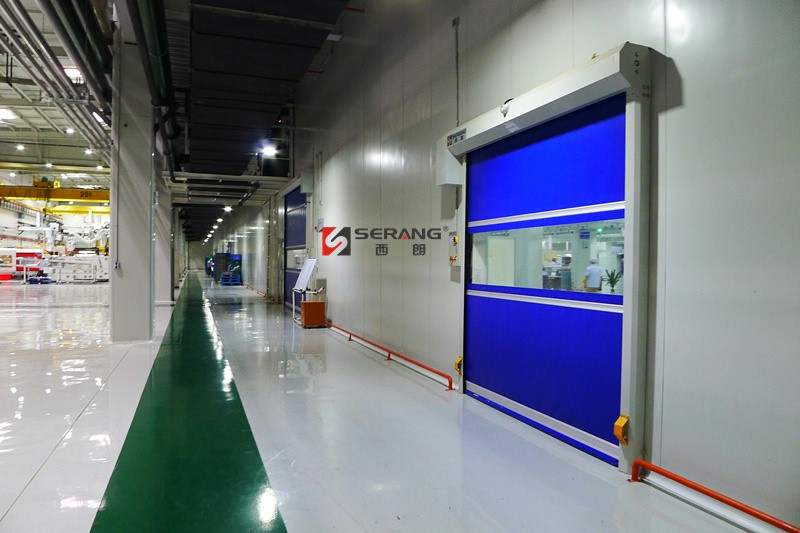 下图:高洁净区配合洁净室、风淋室使用的西朗工业快速门,标准化生产车间每一个出入口都应配备西朗工业快速门。