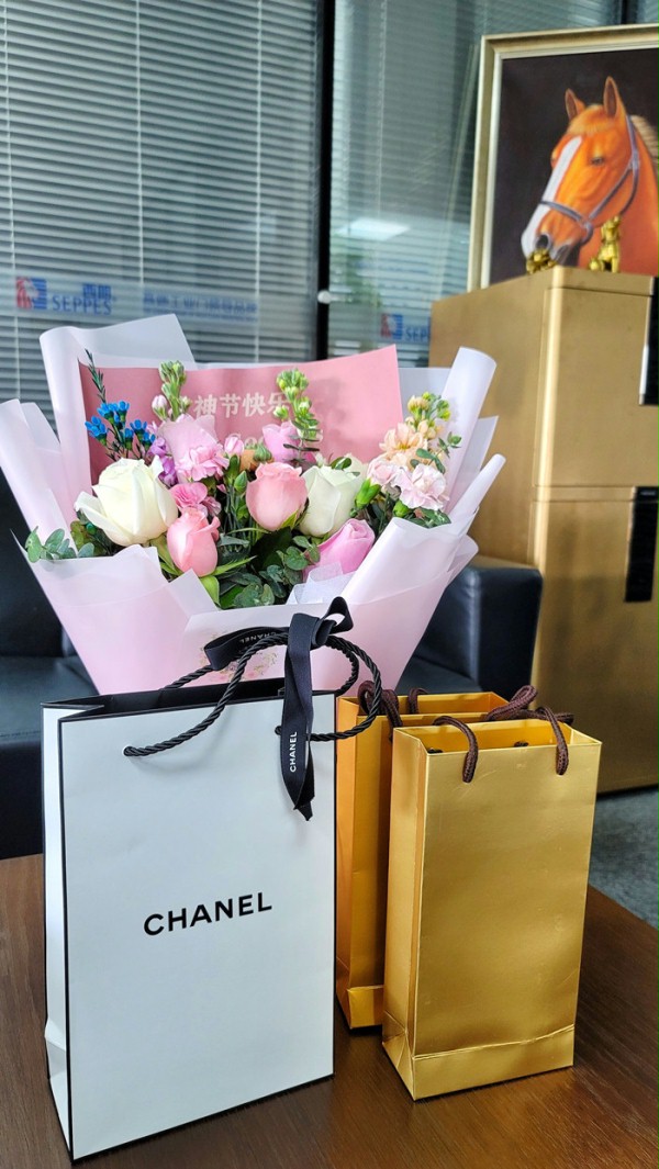 在三八节到来之际,江总安排公司行政部门为女性员工作准备了鲜花与节日礼物,CHANEL香奈儿礼品、FERRERO费列罗巧克力礼盒,体现出对女同胞的尊重与关爱。