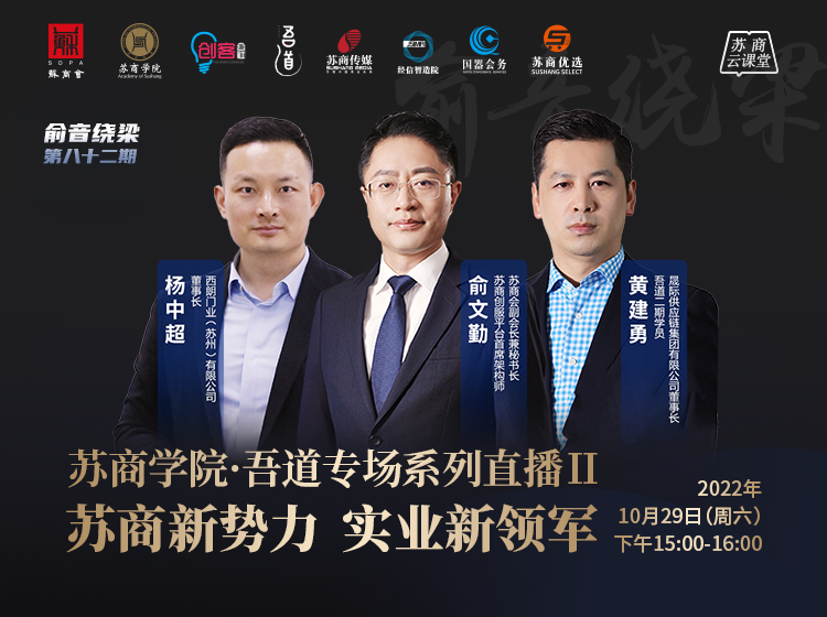 今日之苏州,老牌企业稳居头部阵营,新生代企业也在崭露头角。前有“优等生”,后有“生力军”,新生代企业家如何争当创新引领的“弄潮儿”?10月29日,“俞音绕梁”聚焦“最强地级市”——苏州,对话晟际供应链集团有限公司董事长、吾道二期学员黄建勇,西朗门业(苏州)有限公司董事长杨中超,共寻苏商新势力的增长新动能。