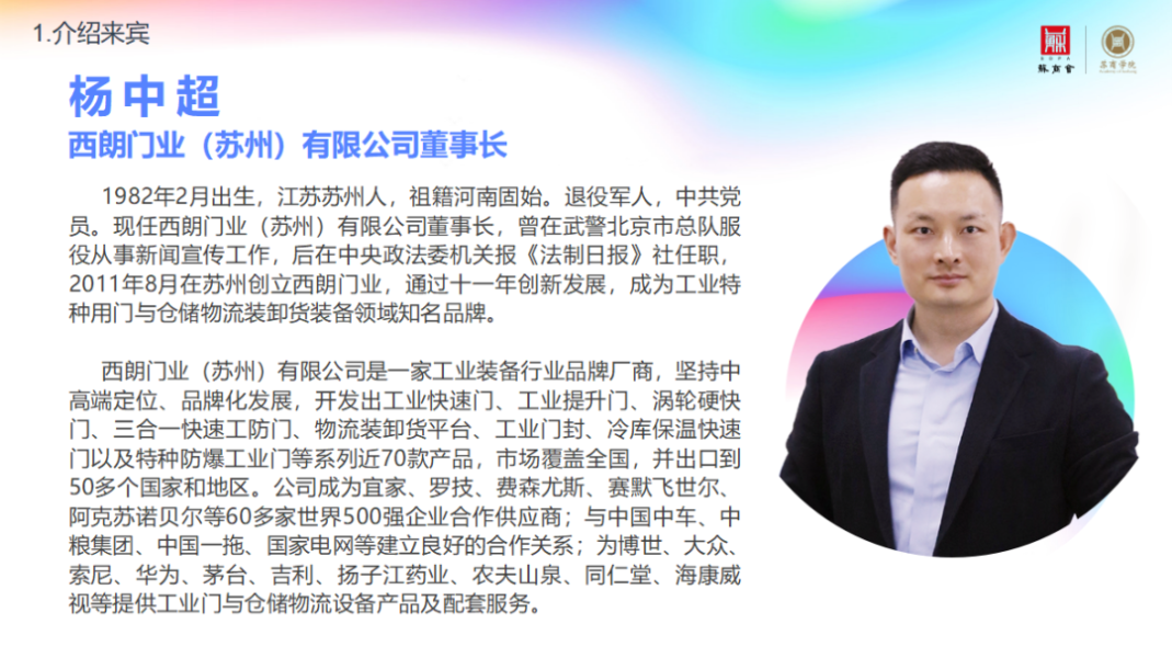 杨中超:今年是创业第11年,当时国内还没有工业特种门,市场基本被国外品牌垄断。作为本土企业,我们用真诚和快速反应,慢慢积累了一些客户。我一直坚信事在人为,中国的企业完全可以和国际品牌竞争。经过这些年的成长,我们确立了中高端的市场定位,并向着品牌化方向发展。目前,我们有3000多家合作公司,包括60多家世界500强企业,还包括大型国企、上市公司,慢慢在全国打开了知名度。然后乘胜追击,三年多前开始进入外贸领域,目前我们的产品出口50多个国家和地区,品牌也慢慢被市场认可。总之一句话,我们的使命是“让全球工厂进出更智能”,愿景是“西朗品牌,服务世界”。