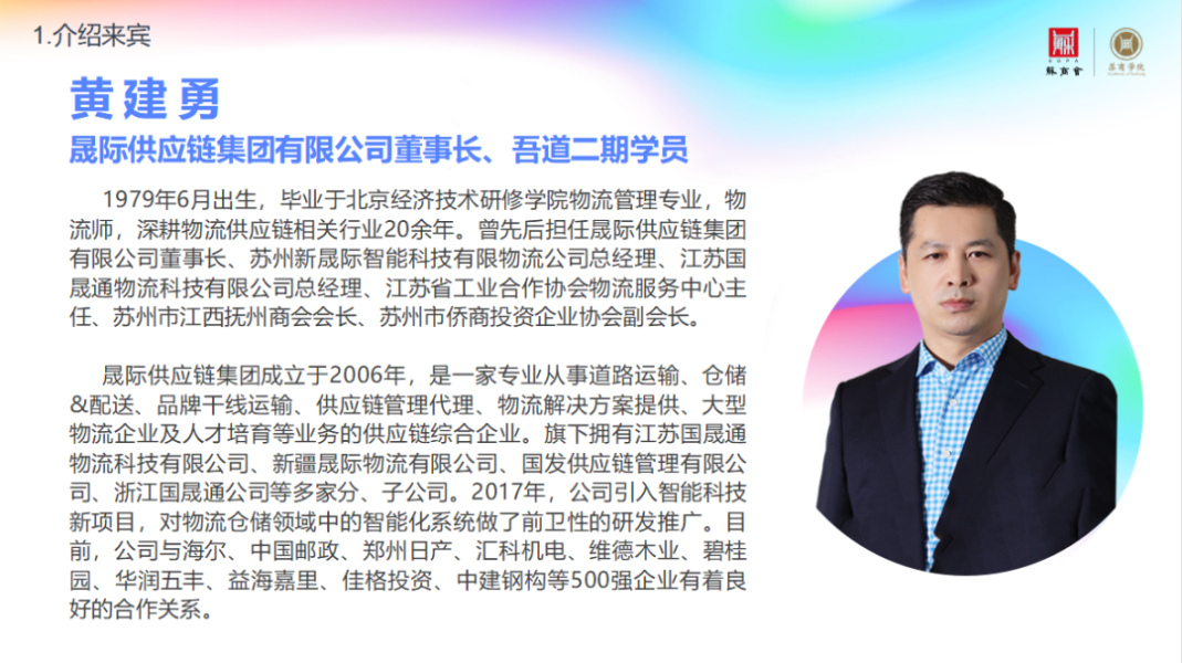 黄建勇:我们公司的主业是物流,从2000年开始在苏州发展起步,以物流+供应链为优势,以数字科技包括数字物流、智慧物流、软件开发等为主营业务。公司的长期目标是每年必须以20%的速度增长,目前我们保持且超过这个数值的增长。经过多年摸索,我们发现在供应链中物流是主要的,现在很多做采购、集采、贸易的业务里都涉及物流,但由于不懂经营,导致供应链成本过高。这就需要物流人去规划,我们就把这些经验真正地搬到了每一处细节上,每一个节点上,每一笔成本上。