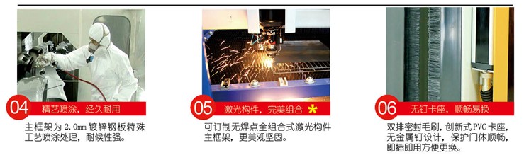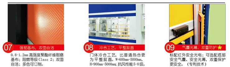 | 门体框架 | 镀锌钢板外部静电喷塑;1.2mm厚;可选配铝合金或不锈钢;双排毛刷密封;订制颜色。 | 门帘材质 | 高强度聚酯纤维耐磨基布,0.8-1.2mm;阻燃等级为Class 2;双面自洁。 |