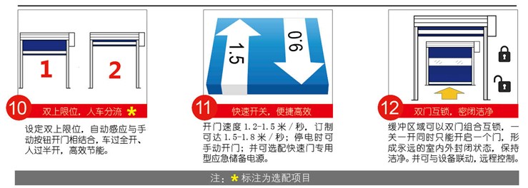 ⑩双上限位,人车分流* ⑪快速开关,便捷高效 ⑫双门互锁,密闭洁净